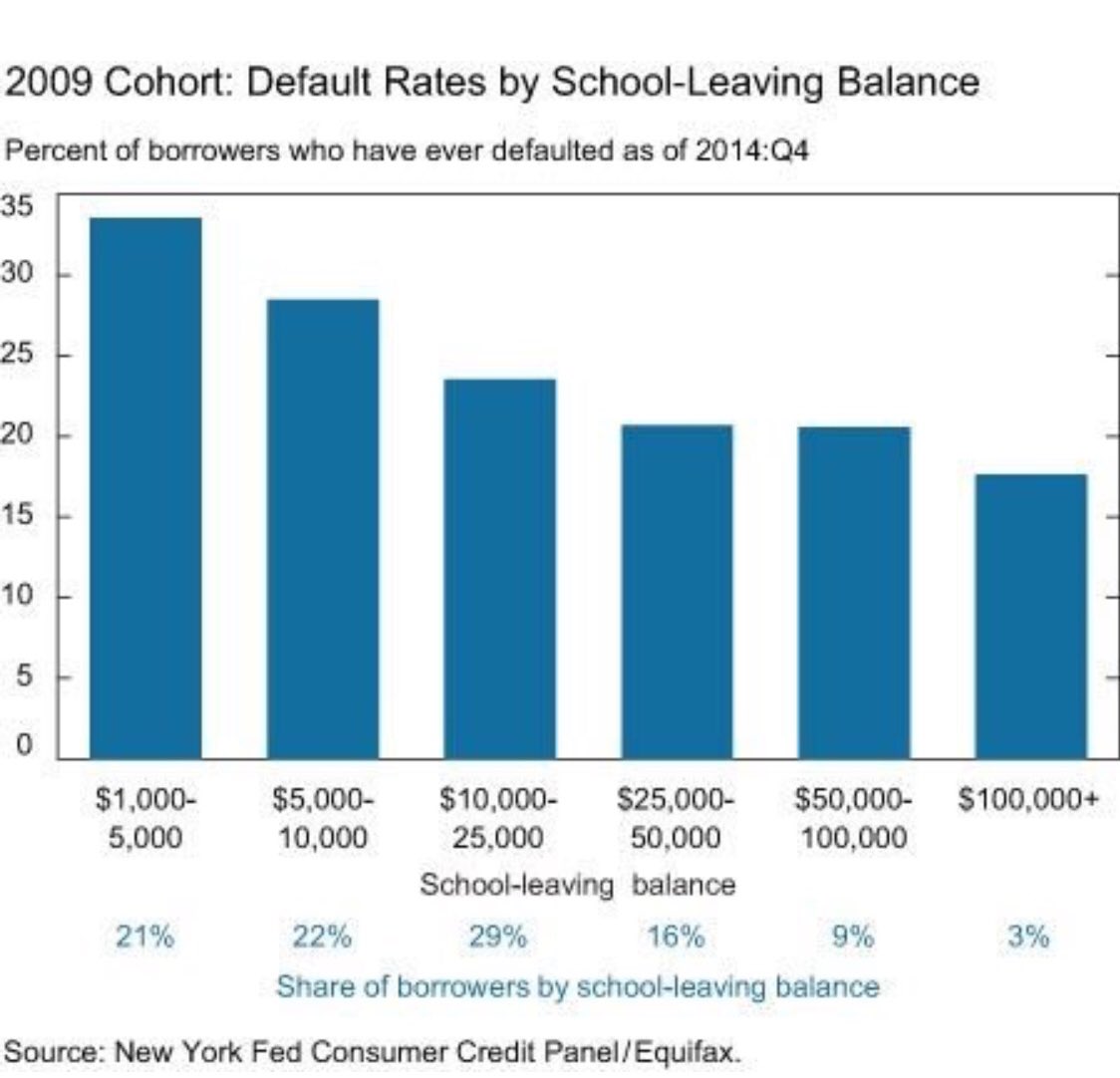 Student loan defaults by loan balance - the less you owe the more likely to default? Which is really a proxy for didn’t complete program.pic.twitter.com/6WHepm13av