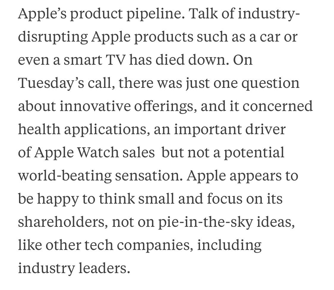 Wall Street analysts who were once bothered by Apple when it was doing all that innovating are now enamored by its “maturity,” stability, and that it’s not wasting all that money on R&D like other tech giants. Time to short.pic.twitter.com/fSIdmCHk5M