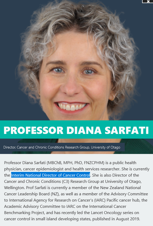 #AEA members may know@DiSarfati. She is the Interim National Director of Cancer Control in NZ & Director of Cancer & Chronic Conditions Group at@otago. Di's work in NZ & the Pacific has focused on improving health services & reducing cancer inequities.#WCEpi2020pic.twitter.com/VvKr7hj4os