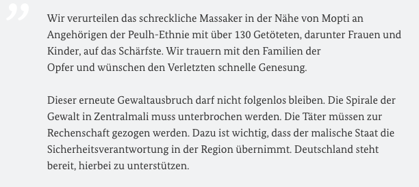 Wir verurteilen das Massaker in Mali mit über 130 Getöteten, darunter Frauen und Kinder, aufs Schärfste. Wichtig, dass malischer Staat wieder Sicherheit garantieren kann. Deutschland steht bereit, hierbei zu unterstützen. https://t1p.de/mshk pic.twitter.com/AlSA8OO5C5