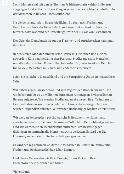 "Sechs Monate nach den gefälschten Präsidentschaftswahlen bleiben die Menschen in Belarus standhaft in ihrem friedlichen Streben nach Freiheit und Demokratie – trotz Gewalt, bitterer Kälte und Festnahmen."