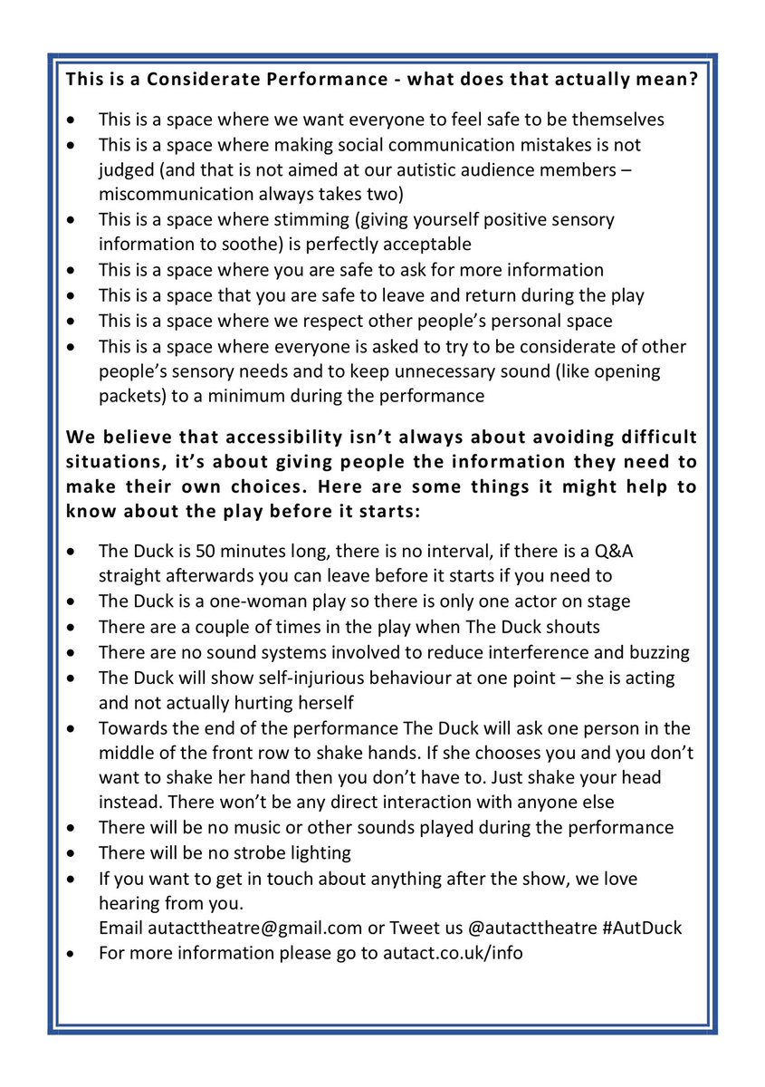 And we have sold out on both nights of our visit to Greenwich Theatre! We cannot wait to see you there tomorrow for @LucyTheobald1’s performance of The Duck, followed by Q&A with writer @outfoxgloved http://Autact.co.uk/info  #theatre #autism #AutDuckpic.twitter.com/lDKDzNNg6I