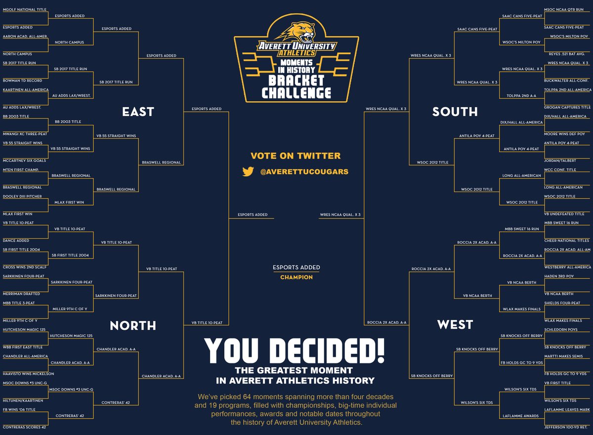 Thank you to everyone for your participation and engagement over the past month! It was a lot of fun. // #AverettBracket #AverettFamily https://twitter.com/AverettUCougars/status/1282812078466772993 …pic.twitter.com/XF8B0a4aQD