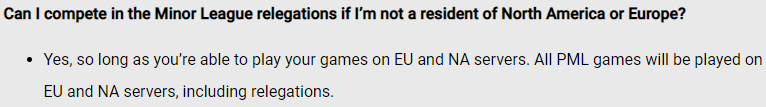 To clarify: You can compete in PML relegations if you are not a resident of NA or EU. This error has been updated and reflected properly in our blog post.