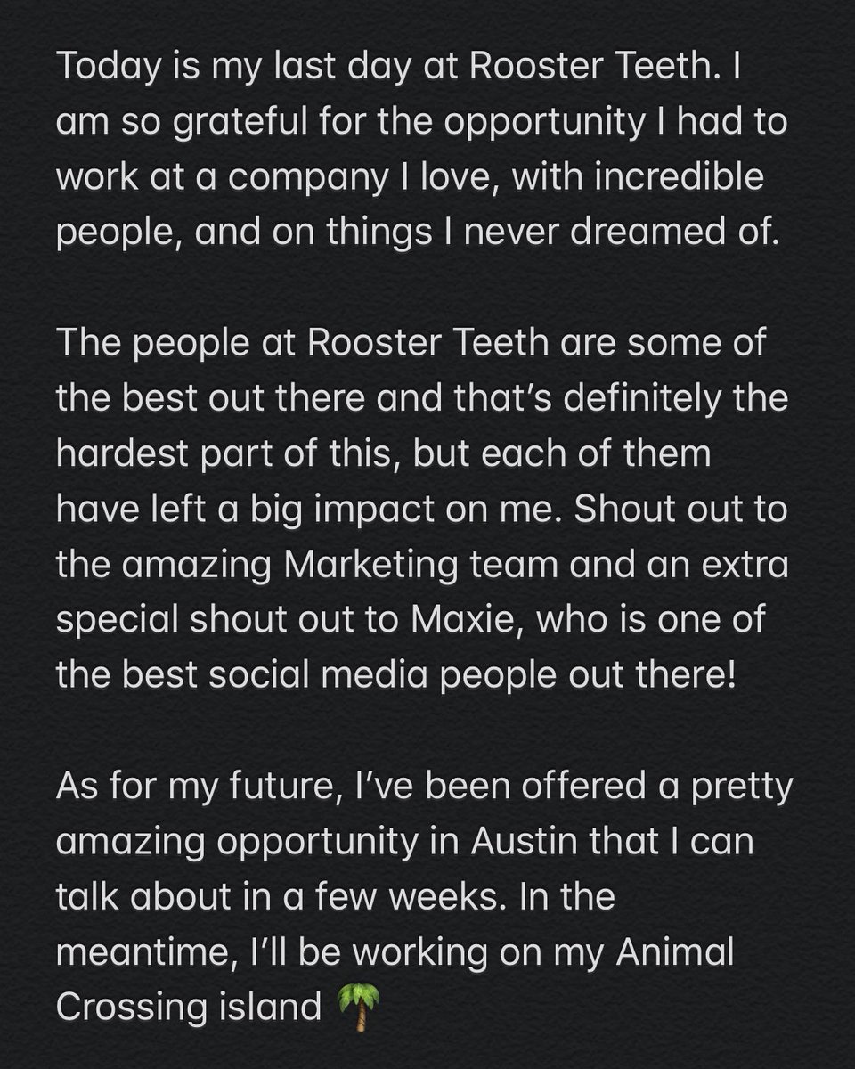 Today is my last day at Rooster Teeth and it’s very bittersweet for me. I’m going to miss everyone I work with and the amazing RT community, but I’m excited for what the future holds.