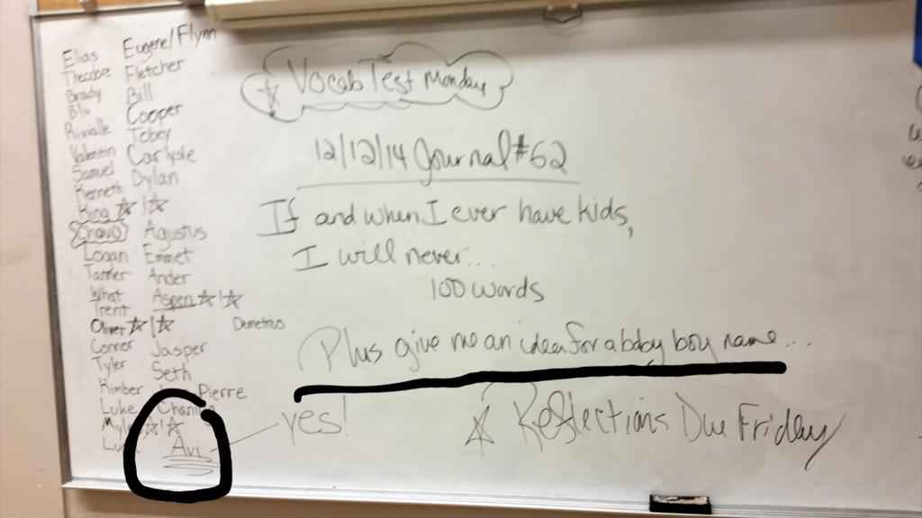 I come into class today and my teacher has asked for names for her kid, and... @Avialencepic.twitter.com/3xYzokLZZb