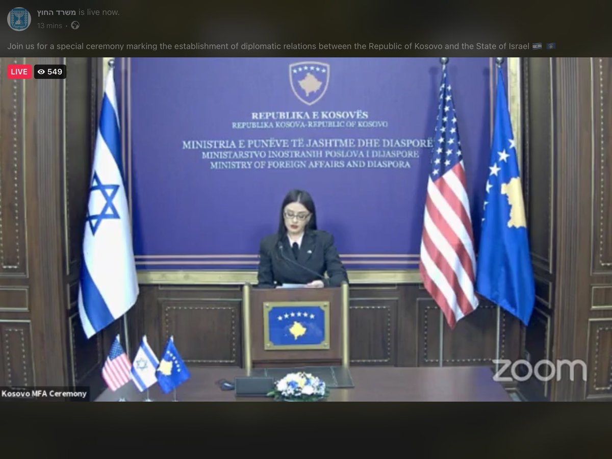 #Israel and#Kosovo , courtesy of zoom.. Israel becomes the 117th country to recognize Kosovo’s independence. Kosovo is expected to open its embassy in Jerusalem, later this year.pic.twitter.com/7kwrqH7vM2