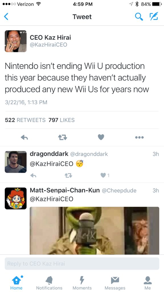@AxiomVerge Nintendo still wants people to buy the Wii U. Publicly saying that they are ceasing production would be throwing money away.Thanks. Twitter will use this to make your timeline better. UndoUndo