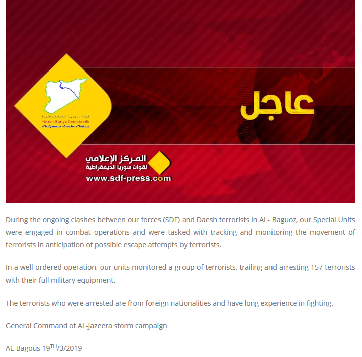 #SDFpress Statement: 157 foreign daesh terrorists were surrounded & captured by #SDF special forcespic.twitter.com/udIlSjeFGg