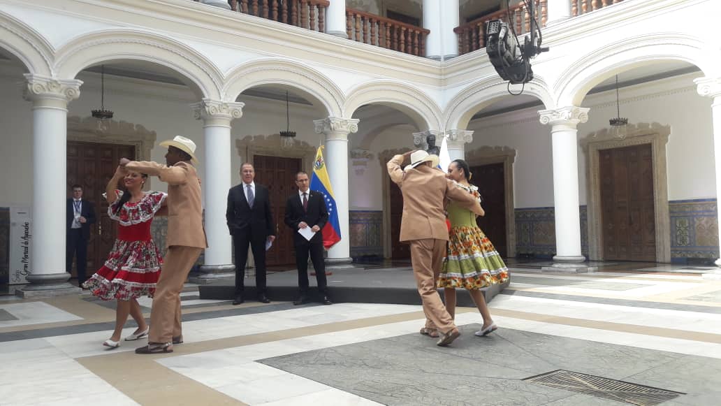#InPictures |#Russia's Foreign Affairs Minister Sergey#Lavrov arrived at the "Casa Amarilla" (Yellow House) in Caracas,#Venezuela. He was welcomed by Foreign Minister@jaarreaza along with an interpretation of Venezuelan folk music.pic.twitter.com/BlSDqeWwwe