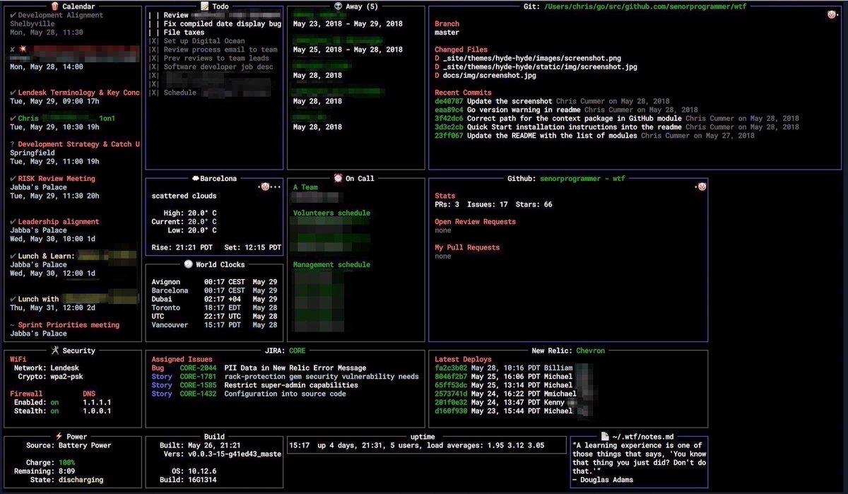 wtf : A personal information dashboard for your terminal : https://github.com/senorprogrammer/wtf …pic.twitter.com/iMEdCaN4tX