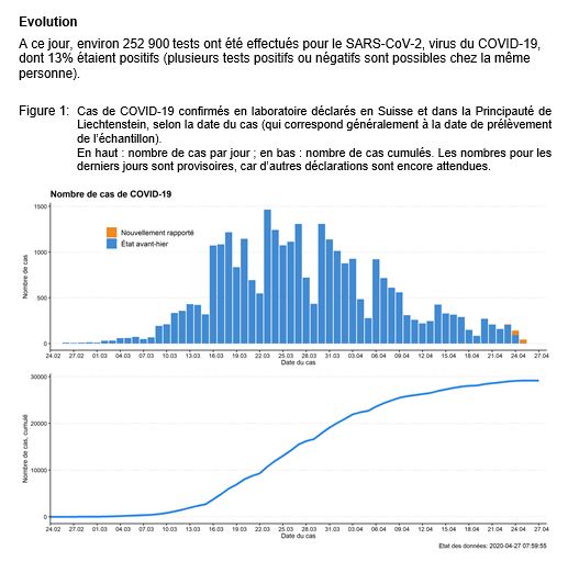 #CoronaInfoCH#Coronavirus#COVID19 27.04 Actuellement, 29'164 cas ont été testés positifs en laboratoire, soit 103 de plus qu'hier. http://bit.ly/3cUqXQx pic.twitter.com/KqUbvjT7QL