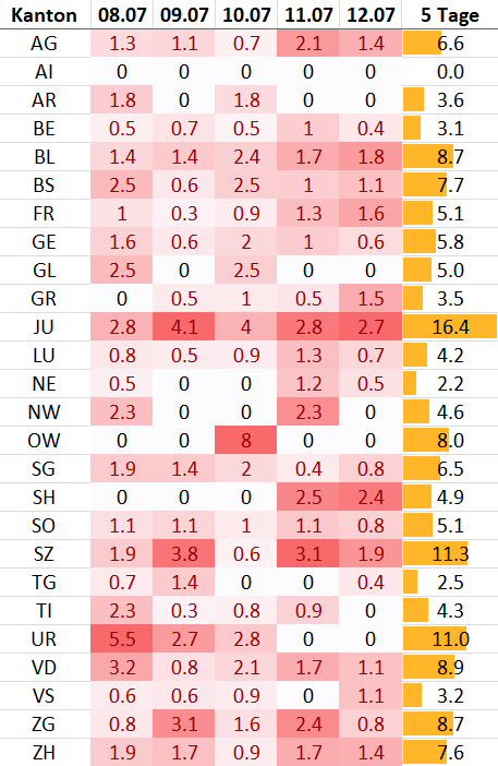 Aufteilung der neu gemeldeten Fälle der letzten 5 Tage nach Kantonen (1) Absolute Anzahl Neuinfektionen pro Kanton (2) Inzidenz pro 100'000 Einwohner Am meisten neue Fälle haben heute: - ZH (21) - AG (10) - VD (9) Quelle: BAG, Meldedatum bis 12.7.pic.twitter.com/c2kWBkw72Q