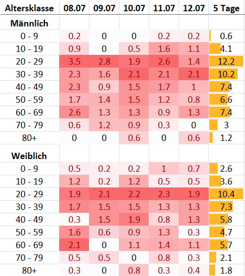 Aufteilung der neu gemeldeten Fälle der letzten 5 Tage nach Geschlecht und Alter (1) Absolute Anzahl Neuinfektionen pro Alterskategorie (2) Inzidenz pro 100'000 Einwohner inkl. Demographie Weiterhin etwas mehr Männer als Frauen Quelle: BAG, Meldedatum bis 12.7.pic.twitter.com/5LNaQPyEmc