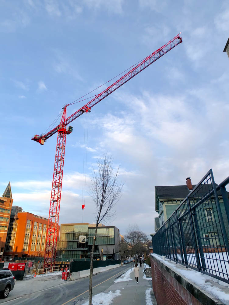 This 200-foot tower crane is the tallest structure on College Hill, part of the construction zone for