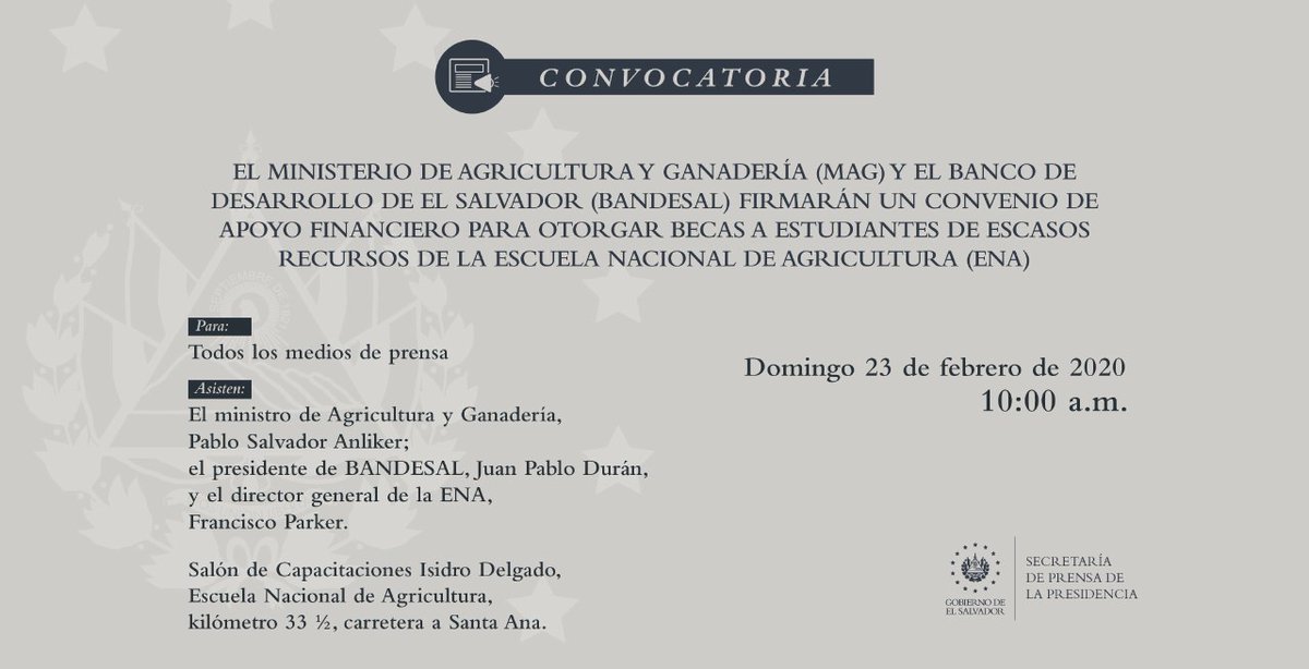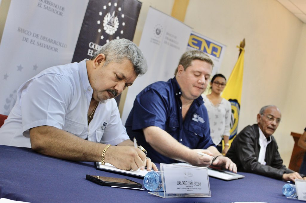 @AgriculturaSV,@Anlikerinfante, el presidente de@BANDESAL,@JuanPabloDuranE y el director de@ENA_ElSalvador,@Parker_Fco, firman el acuerdo para entregar becas a 30 estudiantes que cursan el Técnico en Agronomía.pic.twitter.com/8UpxhiC0UO