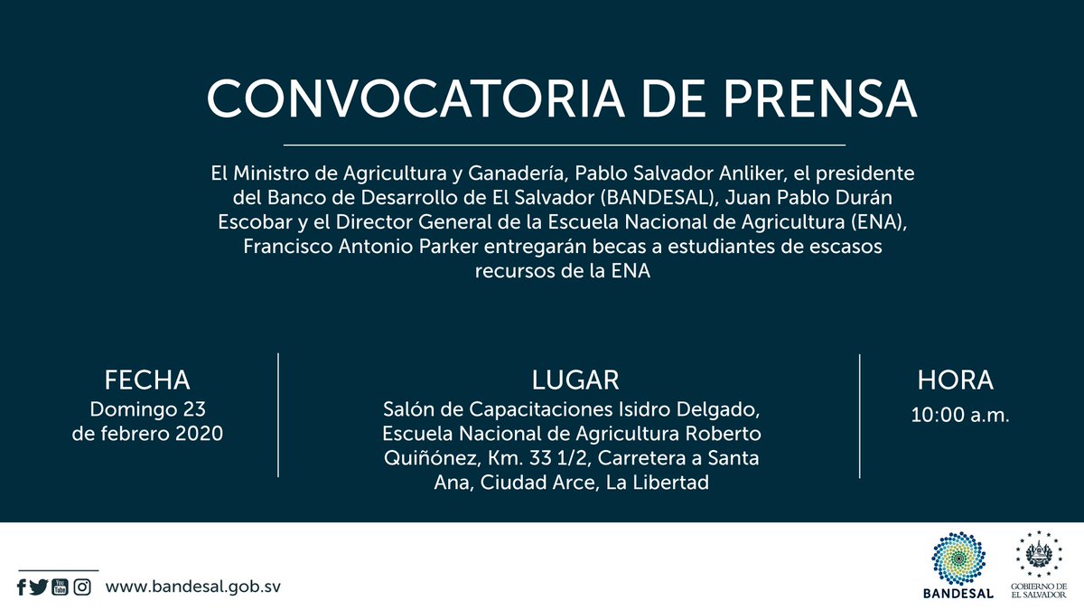 @BANDESAL y Pablo Anliker@AgriculturaSV firman convenio para otorgar 30 becas a jóvenes de escasos recursos económicos con alto rendimiento académico en la Escuela Nacional de Agricultura. El financiamiento de las becas es por parte de BANDESAL.#N4Vpic.twitter.com/IhyekaceQy