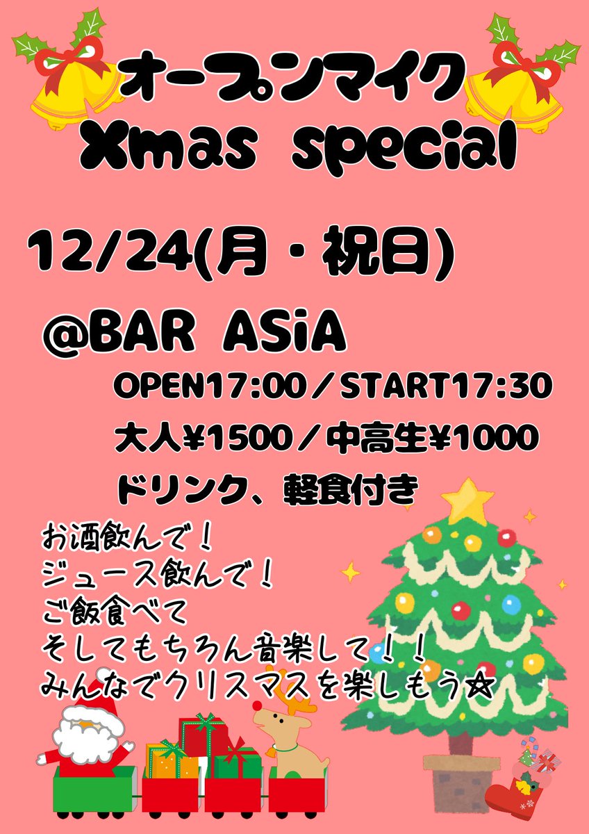 12/24(月・祝)はクリスマスオープンマイクパーティーを開催! オープンマイクなので飛び入り演奏もOK!(事前申請の方優先ですのでご希望の方はご連絡ください) お酒やジュースを飲みながらフードを食べつつ、皆でワイワイしませんか?pic.twitter.com/xJjrrW6Q0z