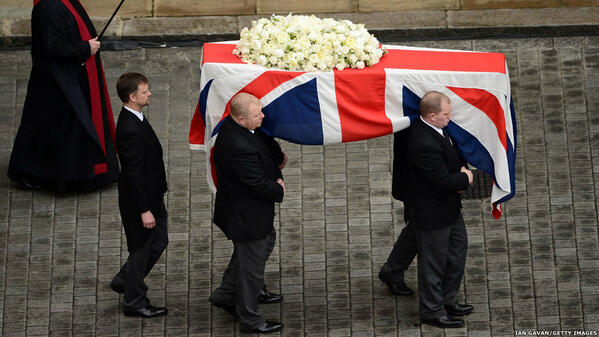 @BBCBreaking: Picture: Baroness#Thatcher's coffin is transferred to the hearse for her funeral procession pic.twitter.com/32wH3yqZbM” RIP