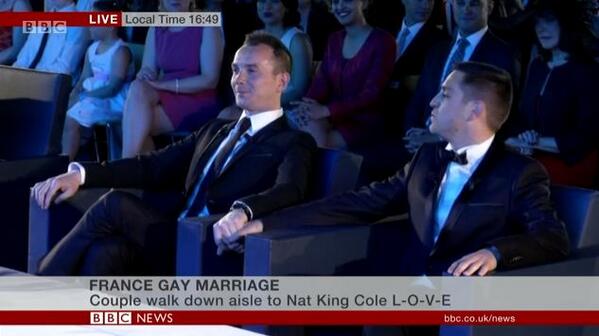 @BBCBreaking:@Vincent_Autin & Bruno Boileau become first gay couple to marry in France http://www.bbc.co.uk/news/world-europe-22702873 … & pic.twitter.com/tOcBTI4Ued”