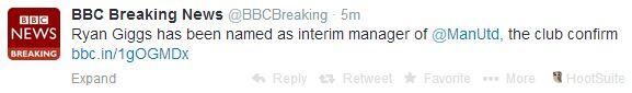 “@BBCBreaking: Ryan Giggs has been named as interim manager of @ManUtd, the club confirm http://bbc.in/1gOGMDx ”