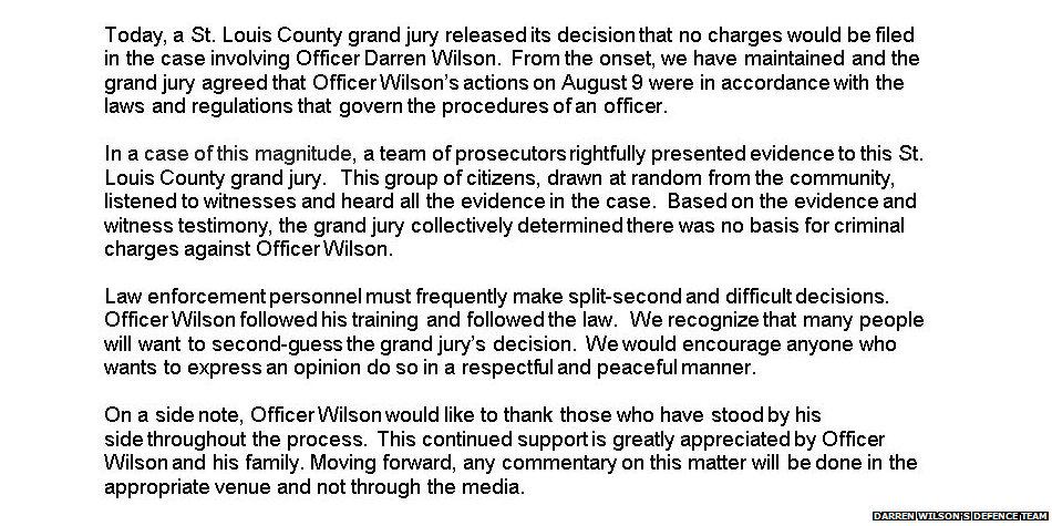 Statement from lawyers of #Ferguson Officer Darren Wilson after #MichaelBrown ruling http://bbc.in/1AJBpDD pic.twitter.com/hSlGDeP5Xm
