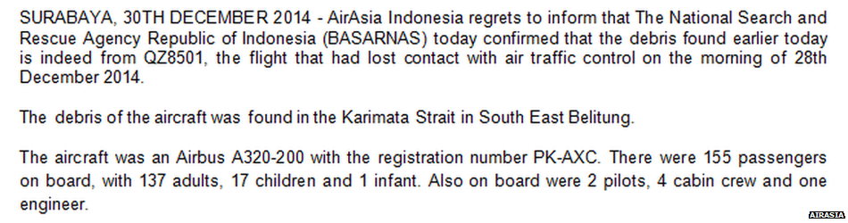 #AirAsia statement confirming debris in Java sea is from missing #QZ8501 http://bbc.in/1HYJ28m pic.twitter.com/MUXFeVVTcx