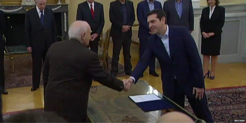 @BBCBreaking: Syriza party leader Tsipras is sworn in as Greece's new prime minister http://bbc.in/1LaOE3U pic.twitter.com/bX3kV10uj0”