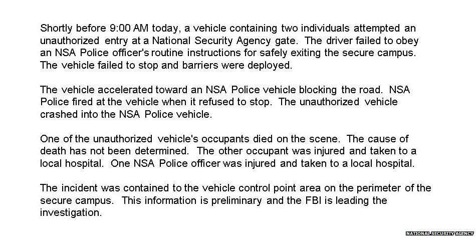 #NSA says, after 1 killed & 2 injured at HQ http://bbc.in/1Mo0CKu pic.twitter.com/78Iq0ULWNE
