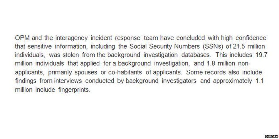 @BBCBreaking: Personal information of 21.5 million Americans stolen by hackers in data breach, says@USOPM pic.twitter.com/zTuanjowpu” Yikes!