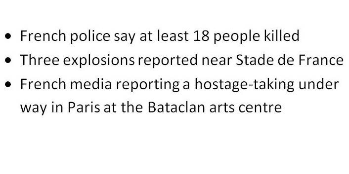 @BBCBreaking 100 hostages taken 40 people reported dead explosions reported at the Stade de FranceThanks. Twitter will use this to make your timeline better. UndoUndo
