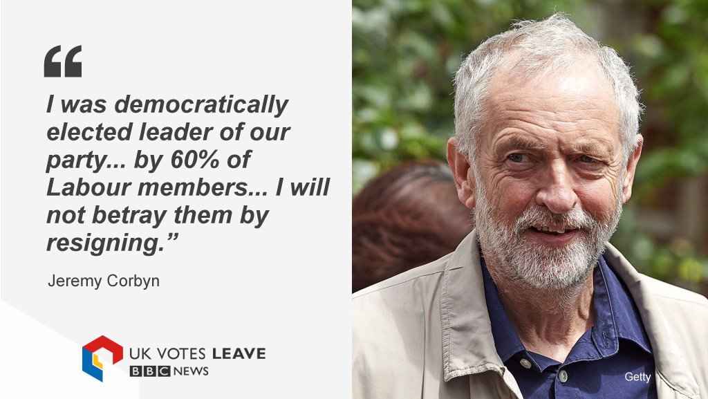 "I will not betray" Labour members & supporters "by resigning", @jeremycorbyn says http://www.bbc.co.uk/news/live/uk-politics-36570120 …pic.twitter.com/KX2twKBggr