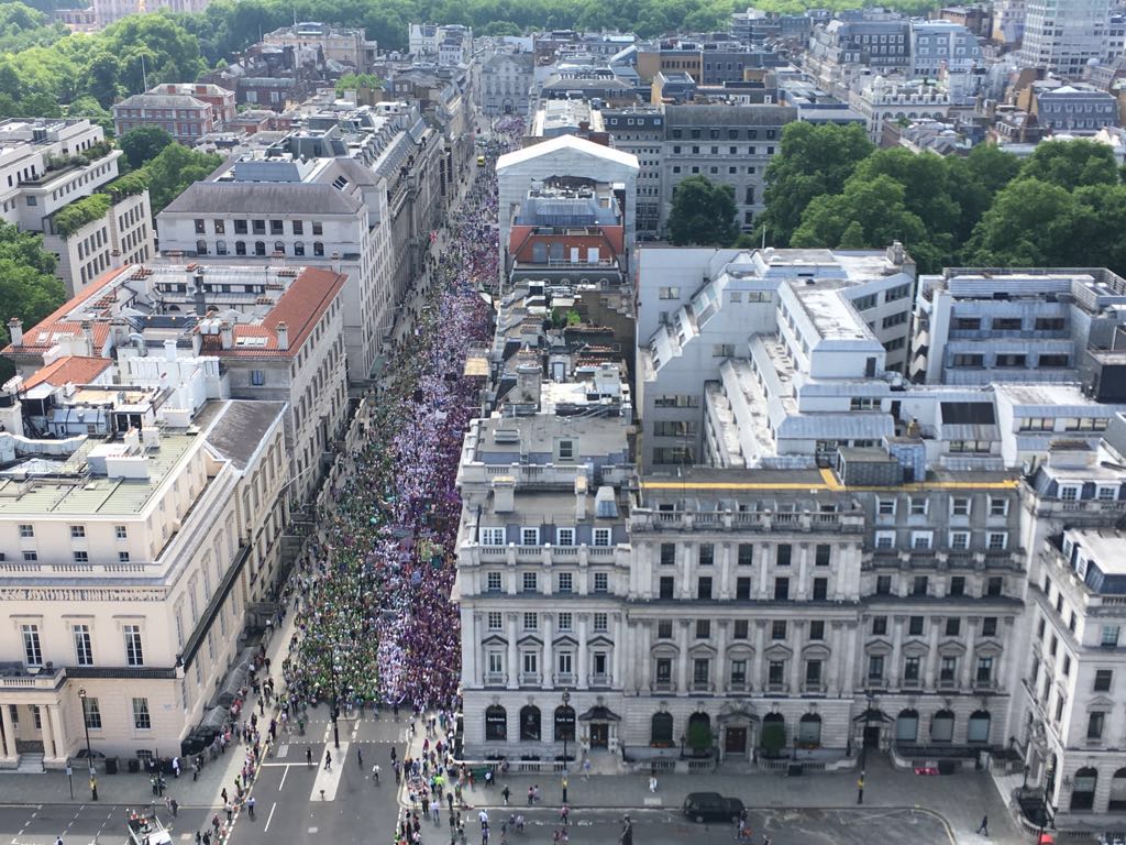 Thousands of women march through London, celebrating 100 years since the first British women won the right to vote. The marchers wore green, white & violet scarves, colours of the suffrage movement. Photo by Times photographer