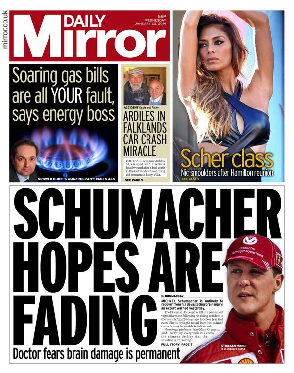 Got to hope this isn't true “@BBCNews: Wednesday's Daily Mirror: "#Schumacher hopes are fading" pic.twitter.com/Wkf6N3GbgJ - via @suttonnick