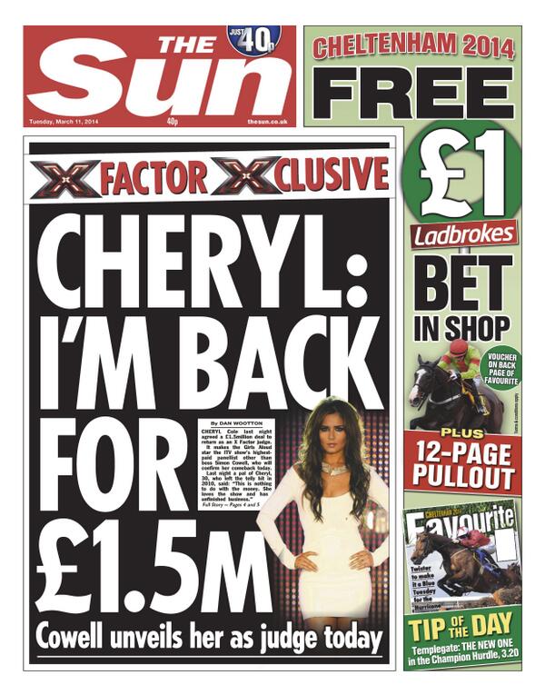 @BBCNews: Tuesday's Sun front page - "Cheryl: I'm back for £1.5m"#xfactor