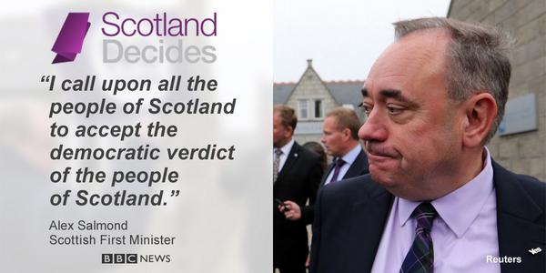“@BBCNews: Scotland's First Minister, Alex Salmond, accepts #indyref defeat http://bbc.in/1wL56lJ pic.twitter.com/U0Zf58yojL”