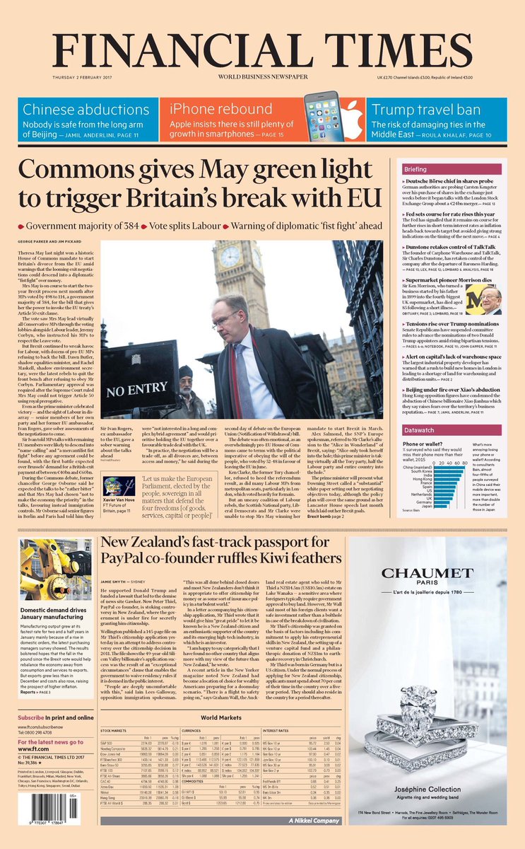 Thursday's FT: "Commons gives May green light to trigger Britain's break from EU" (via @hendopolis) #tomorrowspaperstodaypic.twitter.com/H7DlN3mmxx