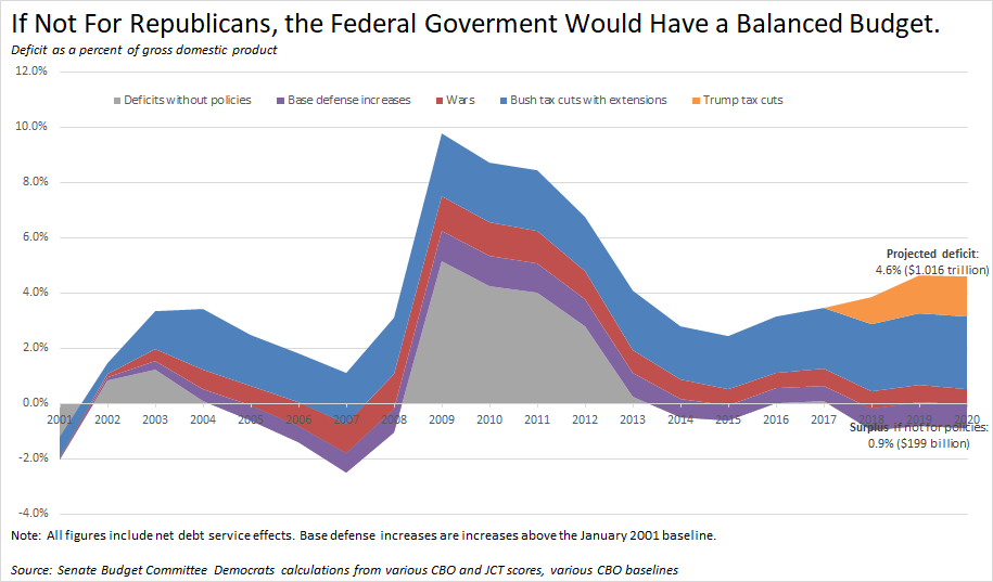 Here's a graph showing deficits over time, and showing the contributions of certain policies. If not for the Bush & Trump tax cuts, we'd be running a primary surplus. Republicans pass huge tax cuts and then call to cut food stamps and disability eligibility "because deficits."pic.twitter.com/77g8ua0V06