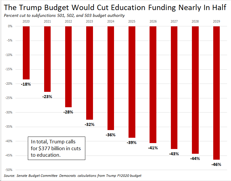 Trump's budget would destroy our federal education efforts. He calls for a 26% to elementary, secondary, & vocational education. He calls for a 64% cut higher education. He calls for a 44% cut to research & general education aids. In total, he'd cut education funding by $377 bn.pic.twitter.com/RLV6RSkumn