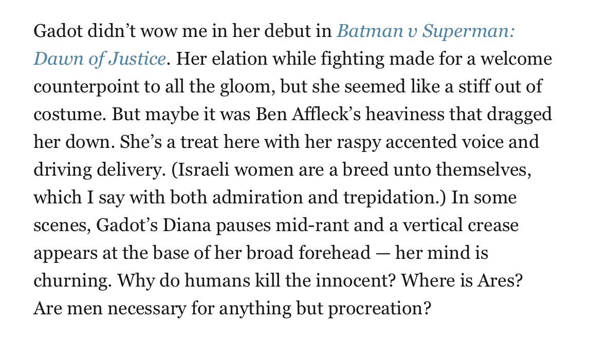 "Her broad forehead" When you have to point out an actors forehead, you're a dildo. And you lose all credibility as a critic of any kind.