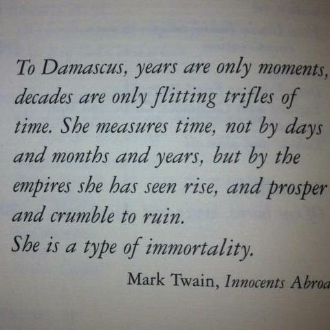 “She measures time not by days and months and years, but by the empires she has seen rise and prosper and crumble into ruin. she is a type of immortality.” Mark Twain (in 1867) on Damascus