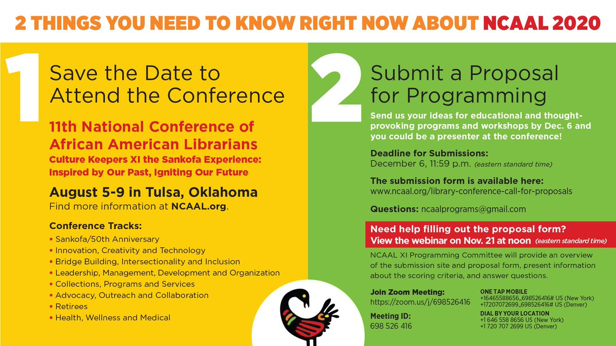 An informational webinar for the National Conference of African American Librarians is planned for Thurs., Nov. 21 at 12 pm - 1 pm EST. It will be recorded and made available afterward. http://bca.la/lDNN50xgBah