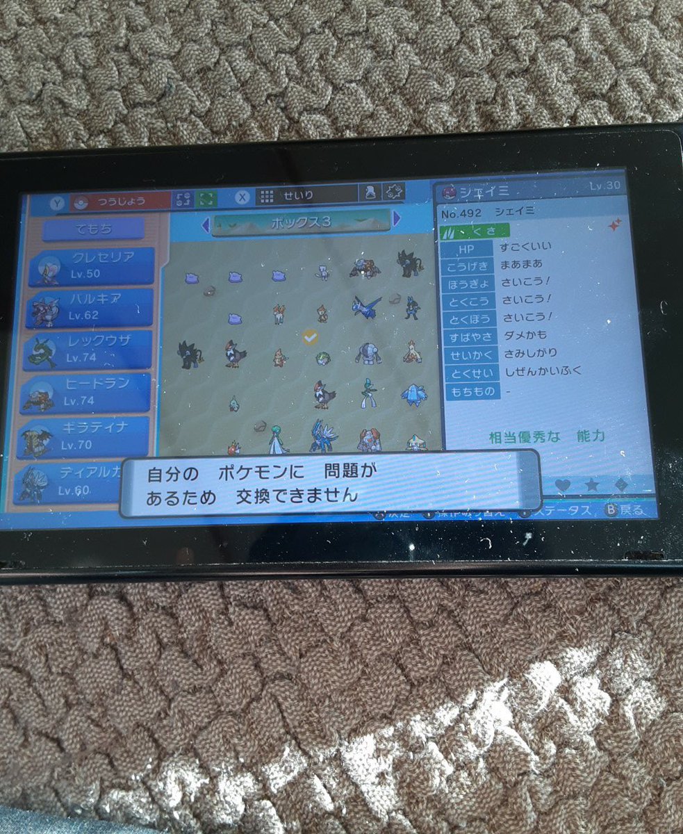 シェイミは仕様によりこういう画面になってしまうのでまだ交換解放されてないらしいですよ!アプデでシェイミ解放されるまでは交換できないと思われます!pic.twitter.com/9xYHubJoEH