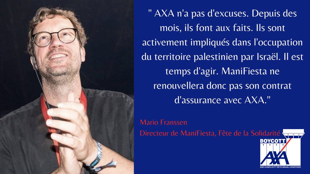 @AXA's complicity in Israel's repressive policy towards the Palestinian people,@manifiesta_be, Belgium's annual Festival of Solidarity, decided not to renew its insurance contract with AXA. Join them. Pledge to#BoycottAXA