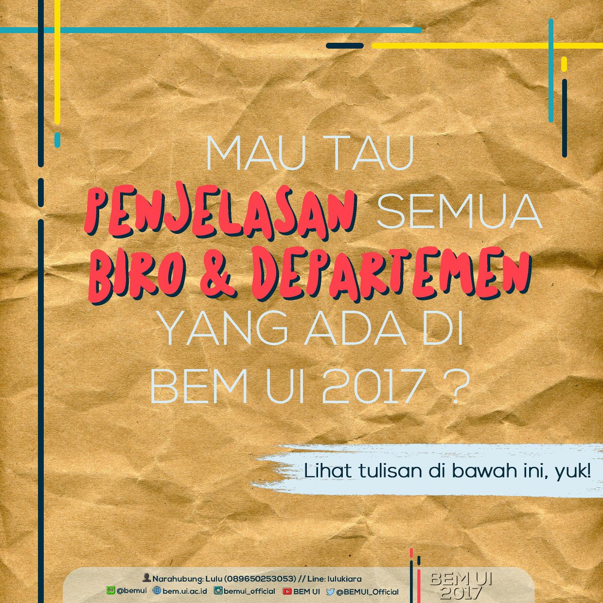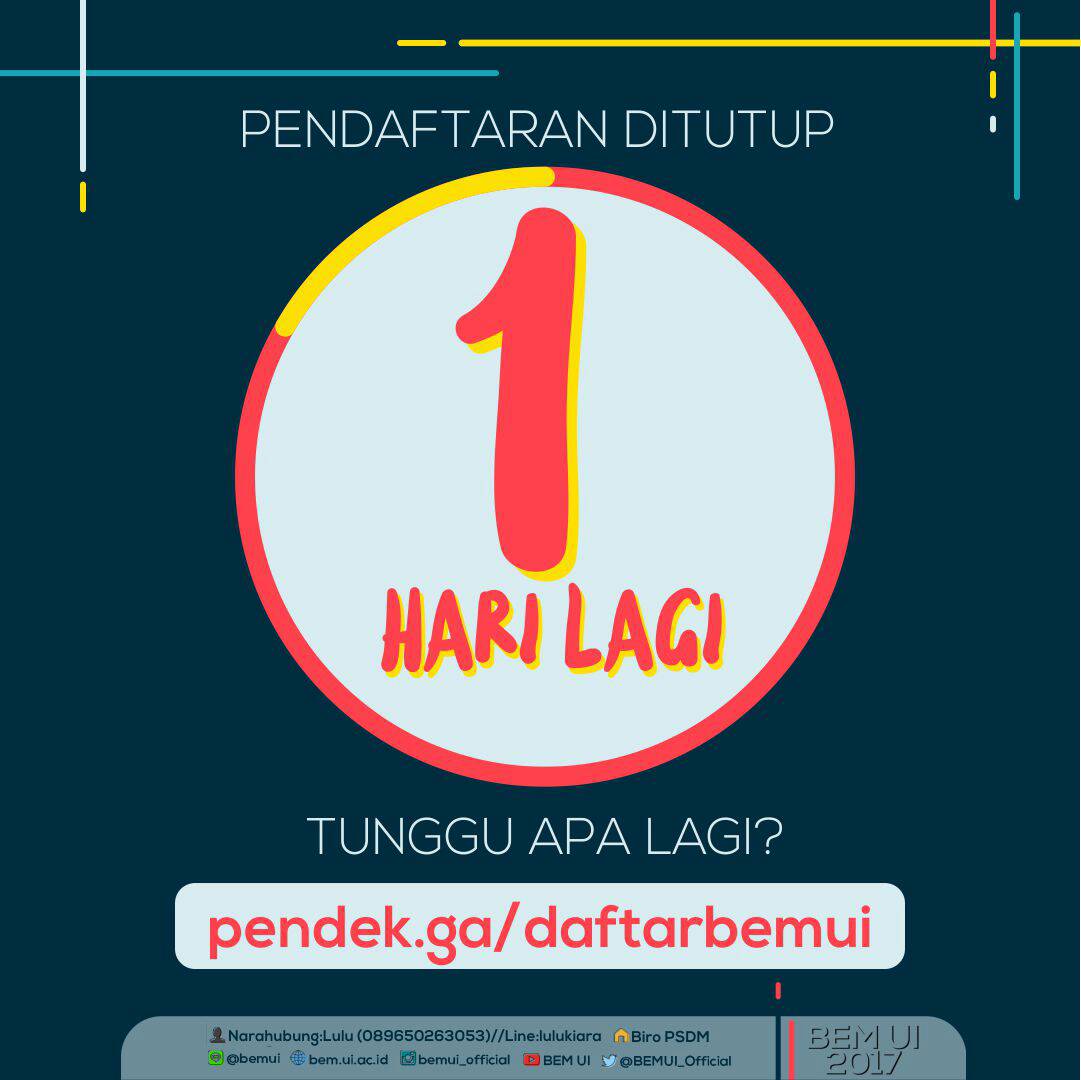 Line BEM UI Official: opl2452d Narahubung: Lulu (089650253053) // Line: lulukiara BEM UI 2017 Kolaborasi Menginspirasipic.twitter.com/NYXa0j699M