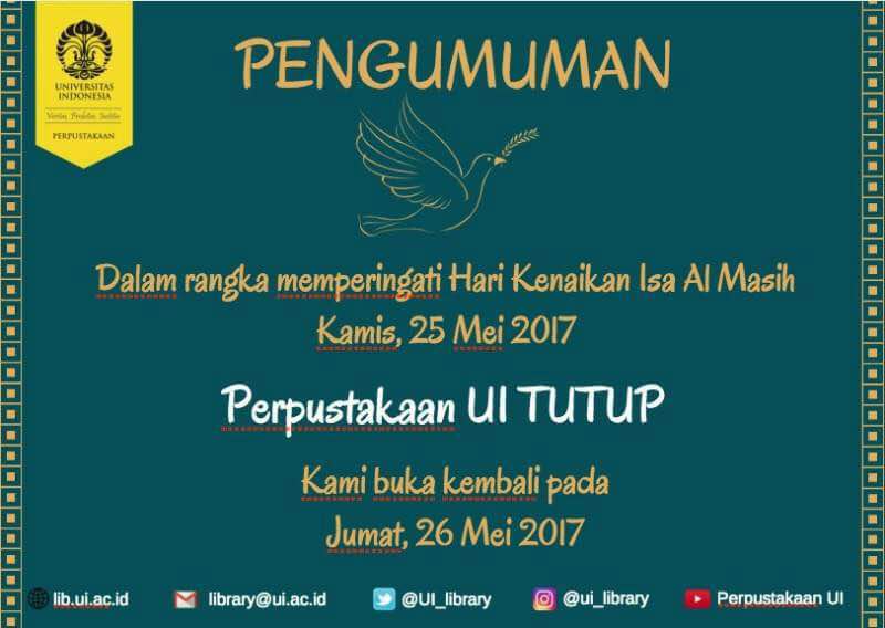 Dalam rangka memperingati Hari Kenaikan Isa Al Masih (Kamis, 25 Mei 2017), kami informasikan bahwa Perpustakaan Pusat UI tutup.pic.twitter.com/ZpZmj9VKlf