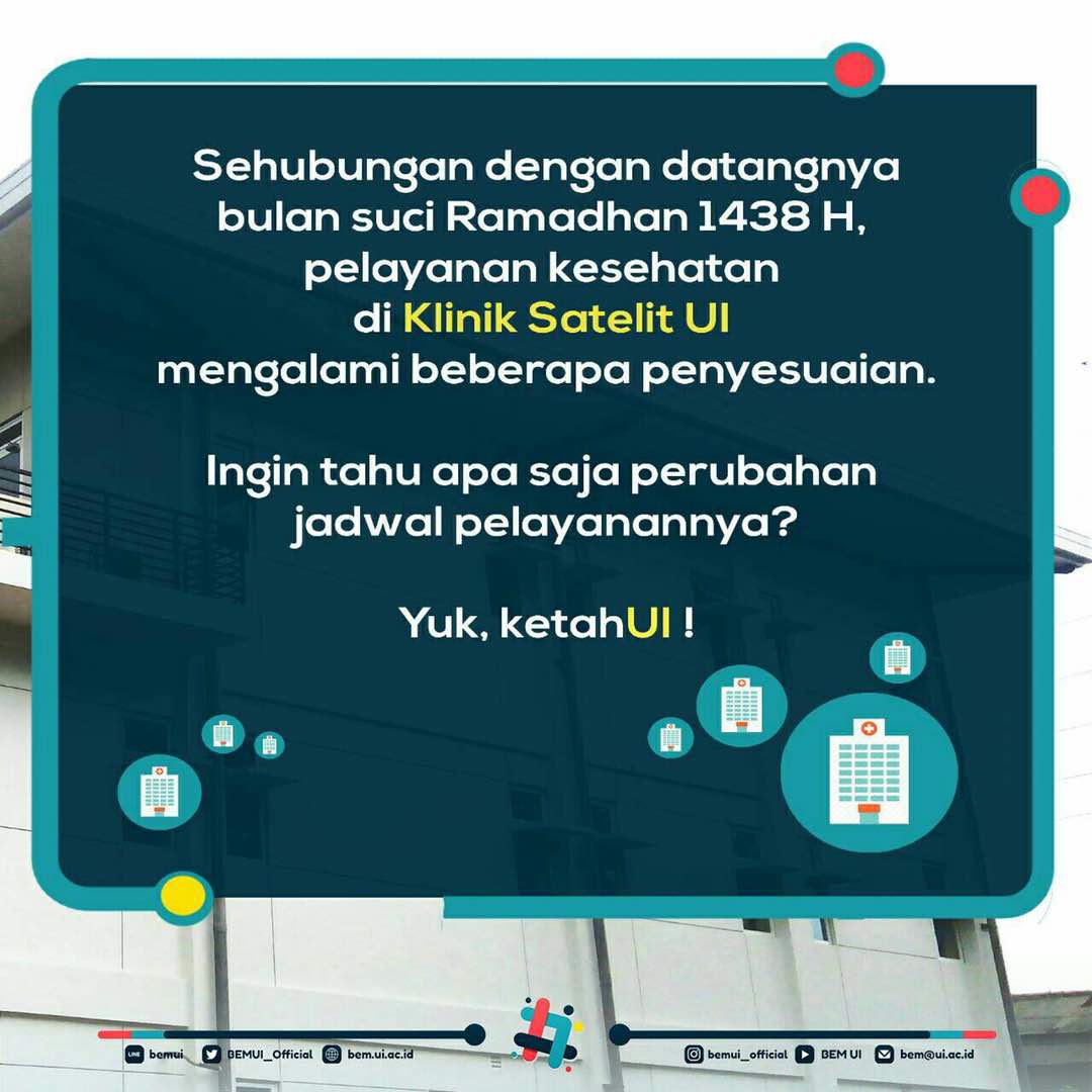 Sehubungan dengan datangnya bulan Ramadhan, jadwal pelayanan kesehatan di Klinik Satelit UI mengalami beberapa penyesuaian.pic.twitter.com/wMyyKruW0D