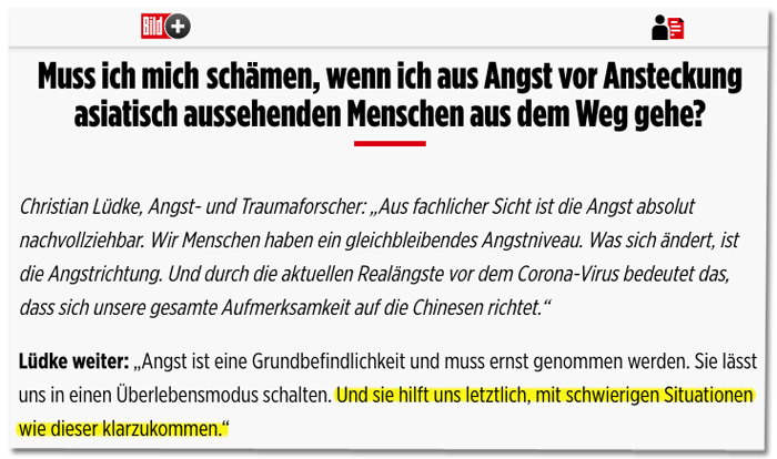 @BILD (zu Recht) sagen, dass das "eine enorme Belastung" sei. Werden "asiatisch aussehende Menschen" ausgegrenzt, darf ein Forscher bei@BILD erklären, dass die Angst vor ihnen hilfreich sei: https://bildblog.de/118301/man-muss-sich-schaemen/ …pic.twitter.com/PB2ofWtoVj