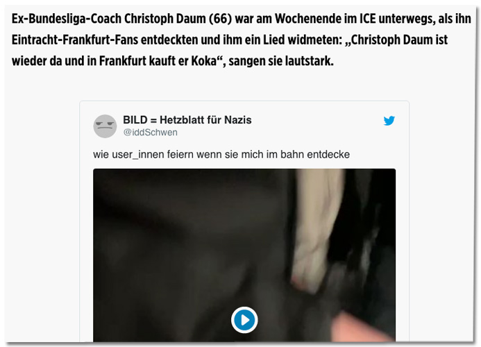 @BILD.de berichten sie über Fußballfans, die in einem Zug für Trainer Christoph Daum singen. Die Redaktion bettet einen Tweet mit einem Video von@KittoDario ein, der direkt seinen Namen ändert.pic.twitter.com/DkIqehdlSx