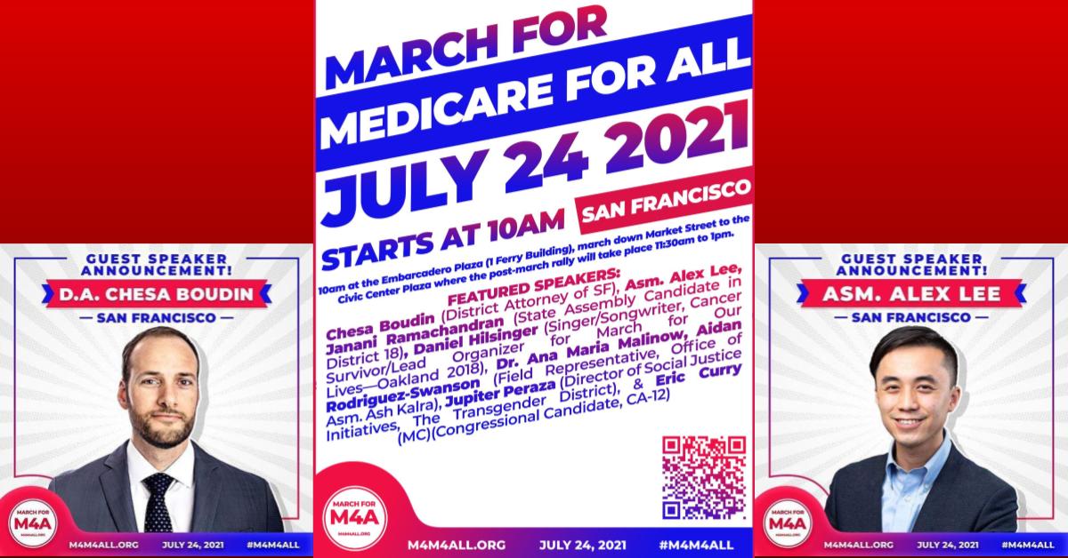 Join SF March for #MedicareForAll, in solidarity w/40+ nationwide #M4M4ALL events! Sat, Jul 24 10-1 RSVP/details: https://www.mobilize.us/mobilize/event/399882/ … March from the Ferry Bldg to Civic Center for the post-march rally from 11:30-1. Great speakers including @chesaboudin, @alex_lee, and more!pic.twitter.com/iSLGPeXddn